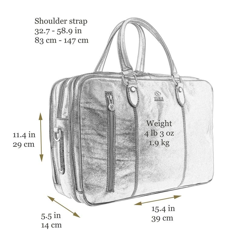 A spacious briefcase for a heavy traveler. This full-grain Italian leather work bag has three compartments and lots of pockets for all your belongings. Carry it in hand, wear it on your shoulder, convert it into a backpack, or use the trolley strap to carry it on a suitcase. Innovative design, premium hand-dyed leather, and clean lines reflect the purpose of this briefcase, which is to make things happen while in style.