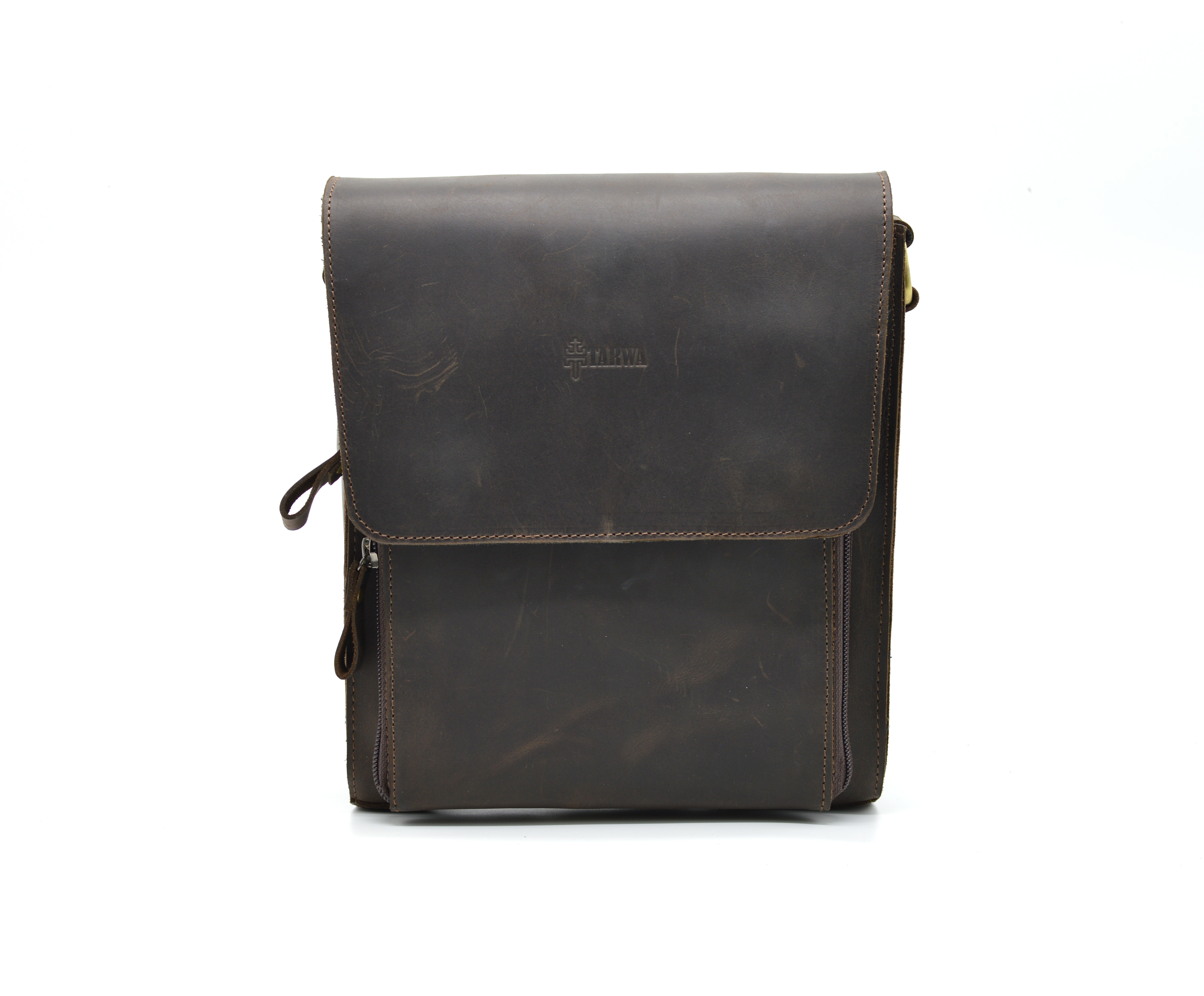 And under the flap there is a very convenient and practical foldable roomy pocket with a zipper with internal leather compartments, for example for plastic cards. There is another zipped pocket on the back of the product. The bag has a leather strap adjustable in length with a textile base that prevents stretching. The special style of the accessory is given by matte brown leather made by crazy horse.